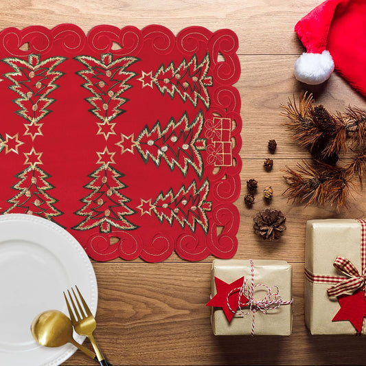 Red Christmas Placemats - 13 X 19 Inch Set of 4, Embroidered Cutwork with Green Christmas Tree and Gifts, Holiday Placemats for Xmas Party Kitchen Decor