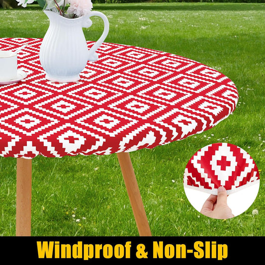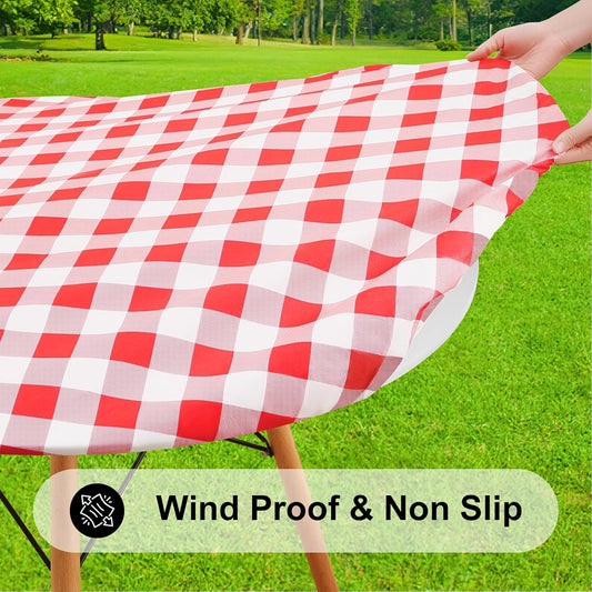 round Picnic Tablecloth, Elastic Waterproof Fitted Vinyl Tablecloths for 36"-44" Tables, Flannel Backed Buffalo Plaid Table Cover for Dining, Camping, Outdoor, White and Red