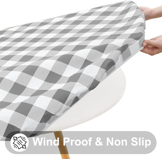 round Picnic Tablecloth, Elastic Waterproof Fitted Vinyl Tablecloths for 36"-44" Tables, Flannel Backed Buffalo Plaid Table Cover for Dining, Camping, Outdoor, White and Grey