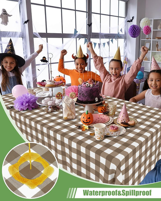 12 Packs Gingham Disposable Table Cloth, 54 X 108 Inch Waterproof Plastic Tablecloth, Rectangle Brown and White Checkered Table Covers for Picnic, Birthday, Party