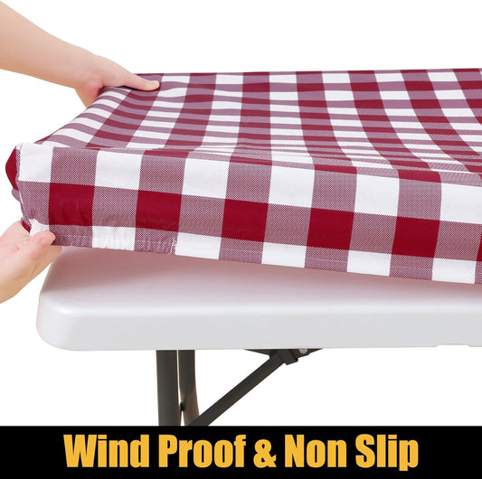 Rectangle Picnic Table Cloth, Elastic Waterproof Fitted Vinyl Tablecloths, Flannel Backed Buffalo Plaid Table Covers for Dining, Camping, Outdoor (Burgundy and White, 30" X 72")