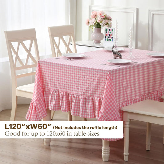 Cotton Coral Pink and White Plaid Ruffled Rectangular Tablecloth, 120 x 60 Inches, Vintage Cottage Gingham Design