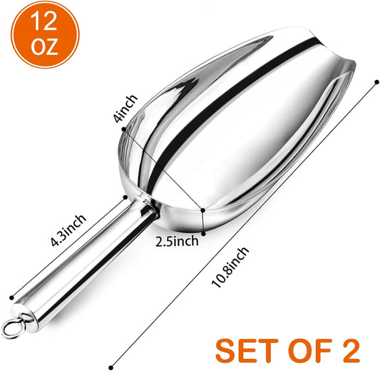 12 Ounce Ice Scoop Set of 2, Stainless Steel Large Food Scoop for Candy Bean Rice Flour Popcorn Cereal, Mirror Finish & Hanging Loop, Sturdy & Dishwasher Safe