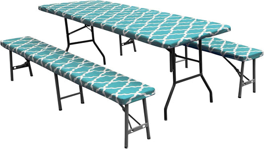 100% Waterproof Picnic Outdoor Tablecloth with Bench Covers Fit 6 Foot Rectangle Table, 3-Piece Set Camping Table Cover with Seat Covers (30X72 In, Moroccan/Teal & White)