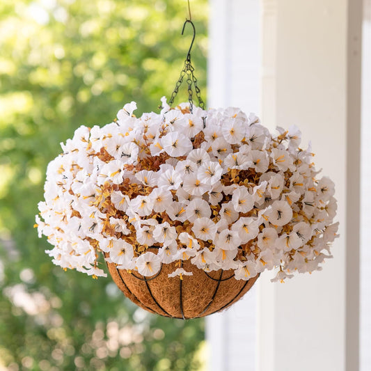 Artificial Fall Hanging Flowers in Basket, 12 Bundles Faux Silk Morning Glory Plants Realistic UV Resistant Fake Outdoor Flower for Planters Home Decor outside Garden Yard Patio, Fall White