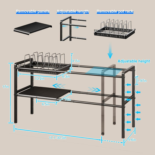 Pots and Pans Organizer under Cabinet, Expandable 2 Tier under Sink Organizers and Storage Adjustable Height Kitchen Pot and Pan Lid Holder Rack with 12 Dividers under Cabinet Shelf(Black)