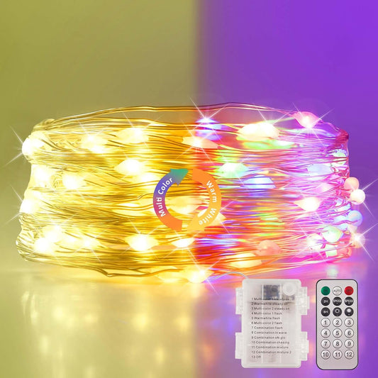 1 Pack Warm White & Multi-Color Battery Operated String Lights, 5M/16.4Ft. 50 Leds Remote Control Timer 12 Modes Optional Twinkle Battery Powered Fairy Lights Sliver Wire Firefly Lights