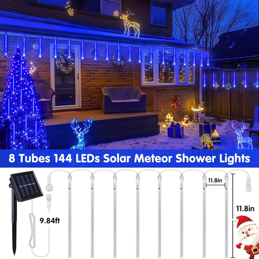 Solar Christmas Lights Outdoor, 8 Tube 144 Leds Solar Meteor Shower Lights Outdoor, Hanging Christmas Light for Gazebo Tree Icicle Garden Yard Party Patio Xmas Decor (Blue)
